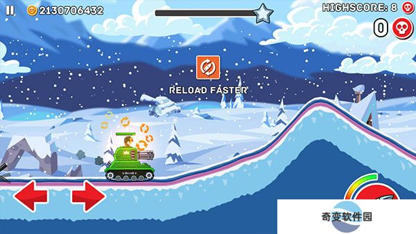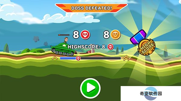 2. 正式开始游戏后,左下角的左右箭头分别控制战车前进和后退,右侧是射击按钮。头顶的绿色血条显示战车生命值,要尽量减少损伤,获得更多胜利。