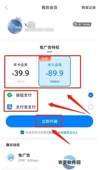 2、进入“我的”会员,选择会员套餐、支付方式,点击【立即开通】。