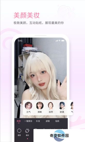 实时直播也能拥有最美颜值。新增5大功能,五官微整、一键美妆、细节补妆、美肤滤镜、互动贴纸,超100种美颜效果。为你的直播颜值保驾护航~
