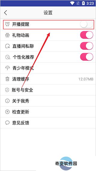 4、勾选“开播提醒”栏目右侧按钮,向左侧滑动进行关闭。