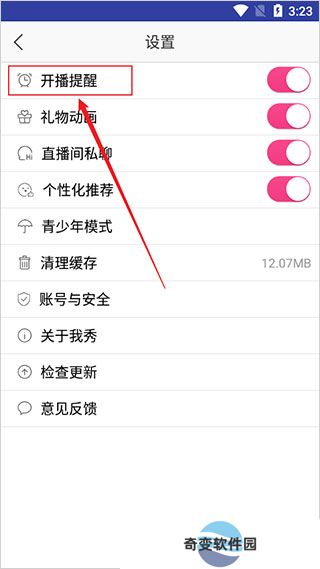 3、进入“设置”页面,找到“开播提醒”栏目。