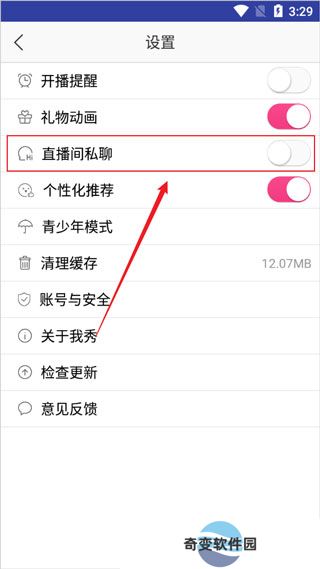 5、勾选“直播间私聊”栏目右侧按钮,向左侧滑动进行关闭。