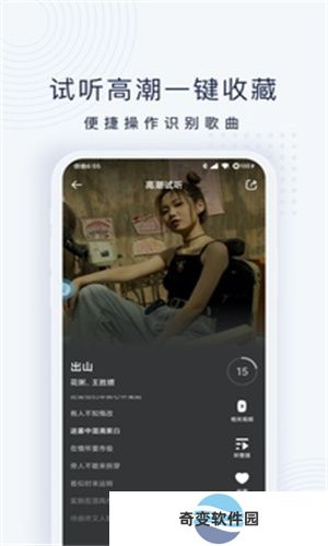 3、识别结果可试听歌曲高潮并跳转到喜欢的播放器上听全曲,搜歌的必备。
