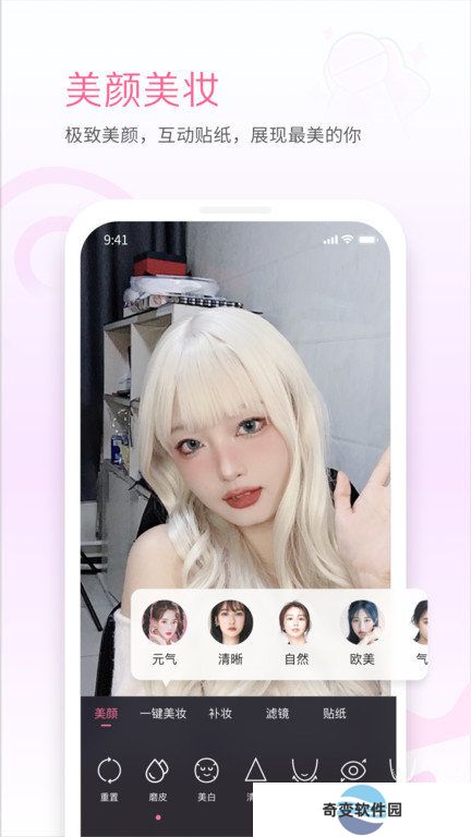 软件功能【美颜美妆】实时直播也能拥有最美颜值。新增5大功能,五官微整、一键美妆、细节补妆、美肤滤镜、互动贴纸,超100种美颜效果。为你的直播颜值保驾护航~